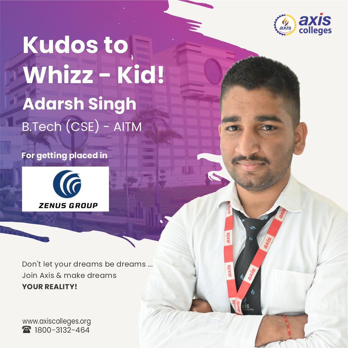 Axis Colleges is delighted to share that Adarsh Singh from the B.Tech has successfully secured a placement offer with Zenus Group, a reputed name in the field of technology delivery solutions.