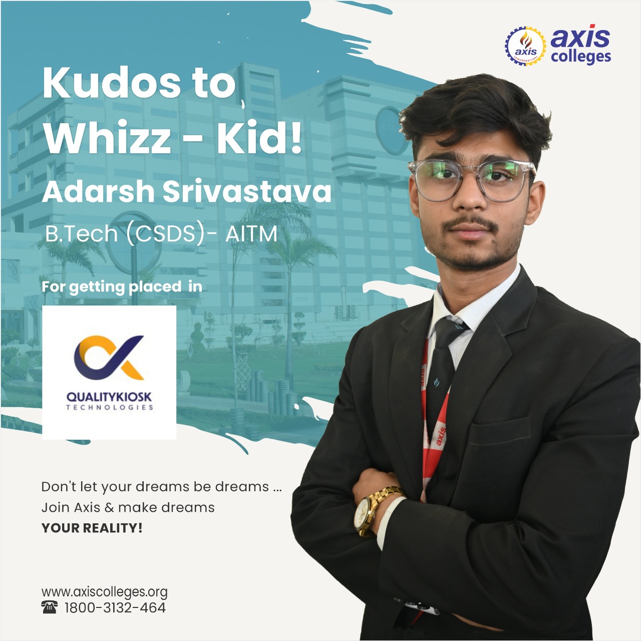 Axis Colleges is delighted to share that outstanding student from its B.Tech programs have been successfully placed at Quality Kiosk Technologies – a recognition of their hard work, skills, and unwavering commitment to excellence