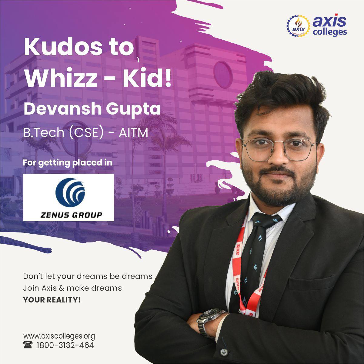 Axis Colleges is delighted to share that Devansh Gupta from the B.Tech has successfully secured a placement offer with Zenus Group, a reputed name in the field of technology delivery solutions.